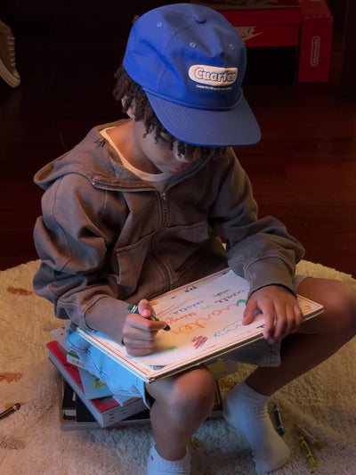 Crafted from vibrant cotton, this cap channels the energy of childhood drawings and crayon-stained fingers. A reminder that creativity was our first language.
